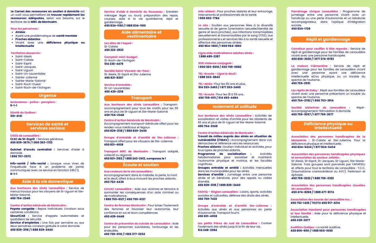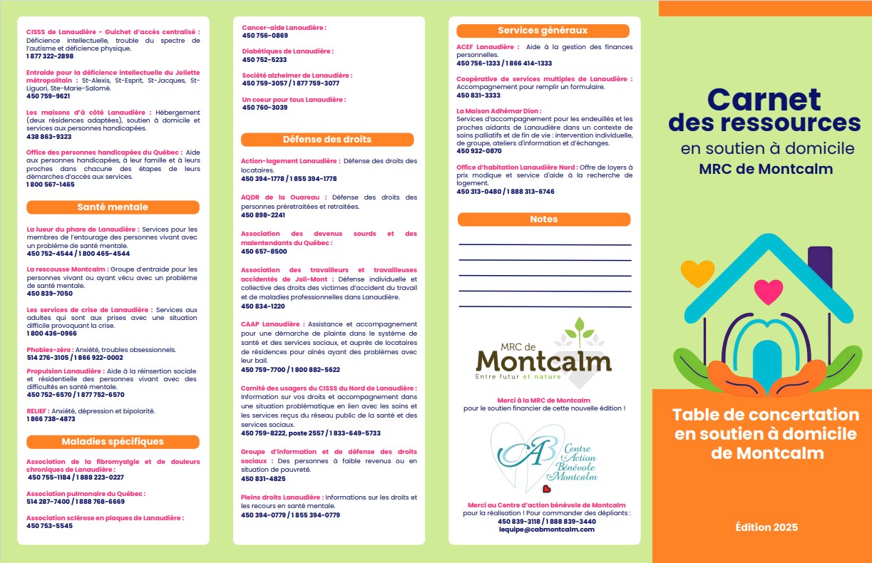 Le CAB Montcalm (centre d'action bénévole Montcalm) prépare et met à jour, un carnet avec les différentes ressources disponibles dans la région en matière de santé et services sociaux.
