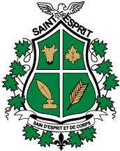 L'écusson comporte en son sein une croix dominée par la colombe, symbole du Saint-Esprit indiquant nos origines religieuses. La fleur de lys souligne nos appartenances françaises; les feuilles d'érable qui ornent l'ensemble indiquent notre pays d'appartenance.